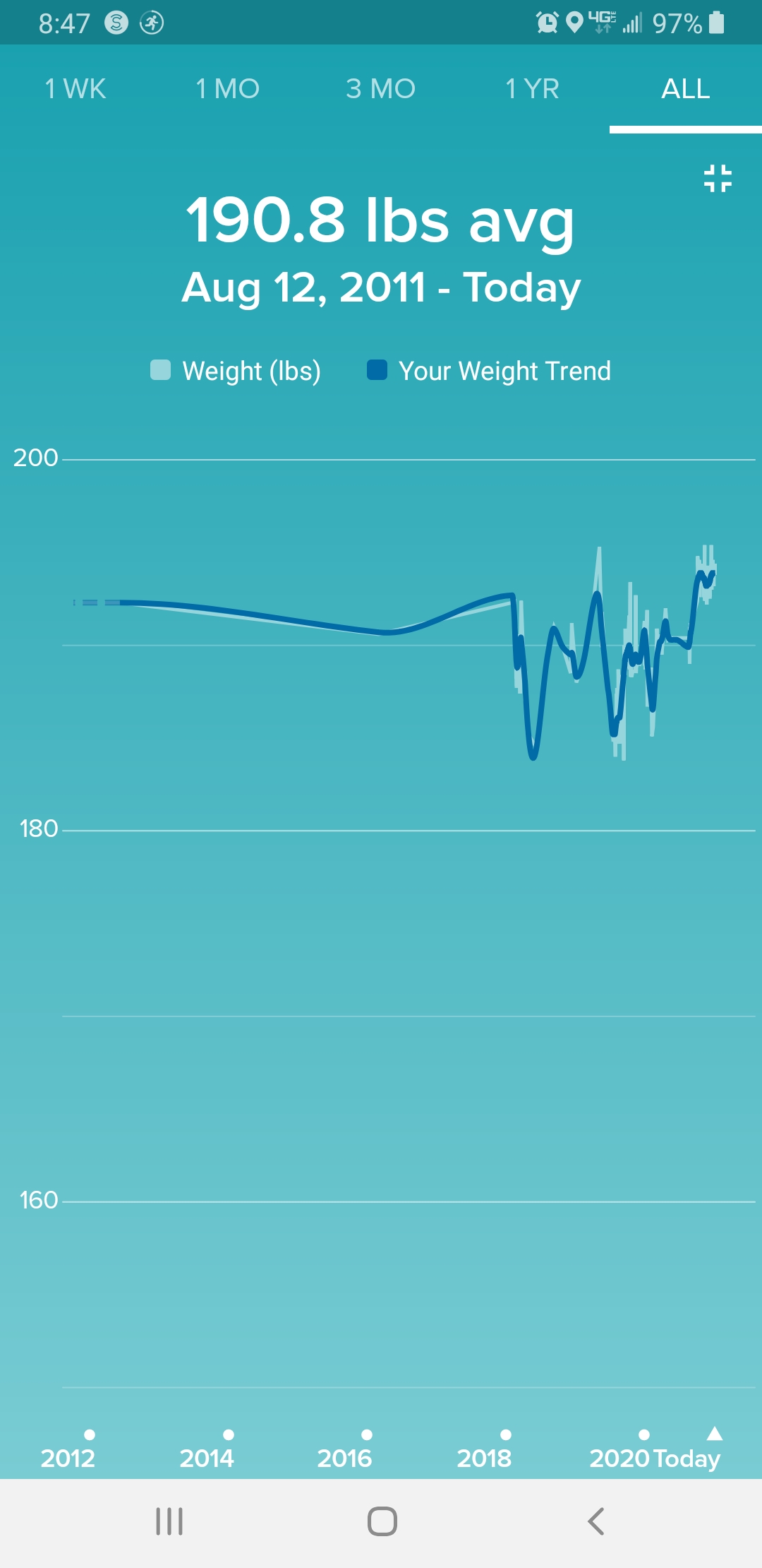 I have no idea what my body fat percentage is (the Aria 1 measured it until the whole device quit working, but my replacement, the Aria Air, does not, and the handheld scanner I bought as a substitute just says I’m so fat that it can’t read me), so it will be a while yet before I can try adding that as stat I’m (hopefully) progressing in.