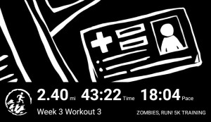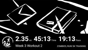 The last two workouts of “week 3” in the couch-to-5K app… and I made it faster than before. Still without any actual running involved, and no major sciatica flare-up this time. Granted, the weather was decent most of the week, and the roads, even mine, had been cleared off before I set out to do my walk, so that made a considerable difference to both my speed and the lack of back pain, but I’m still amazed at those numbers.