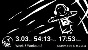 My pace managed to pick up again from what it’s been the last couple of weeks, but I have a feeling I’m starting to level out at this point; with as little time as I have left until the end of the story from the 5K app, I probably won’t see another significant improvement until I start back in to the main app… and maybe then I can blame my current pace on the fact that my legs want to fall off after walking for so long!