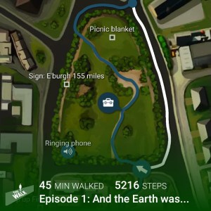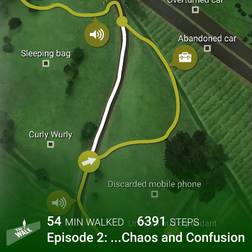 Fourth problem? Unlike Zombies Run, The Walk has no music option. You can play music on another app, but there is no “pause the music when dialogue is playing” feature. If, like me, you prefer to have the audio clips auto-play when you unlock them (something I’m doing the first time I play each episode, but won’t do the second go-around if the previously mentioned plan works as planned because I’ll likely be listening to Zombies Run for part of it) you’ll want to make sure the volume is set so you can hear the story over your music. And if you don’t have music playing in the background… prepare for a lot of silence between audio clips.
