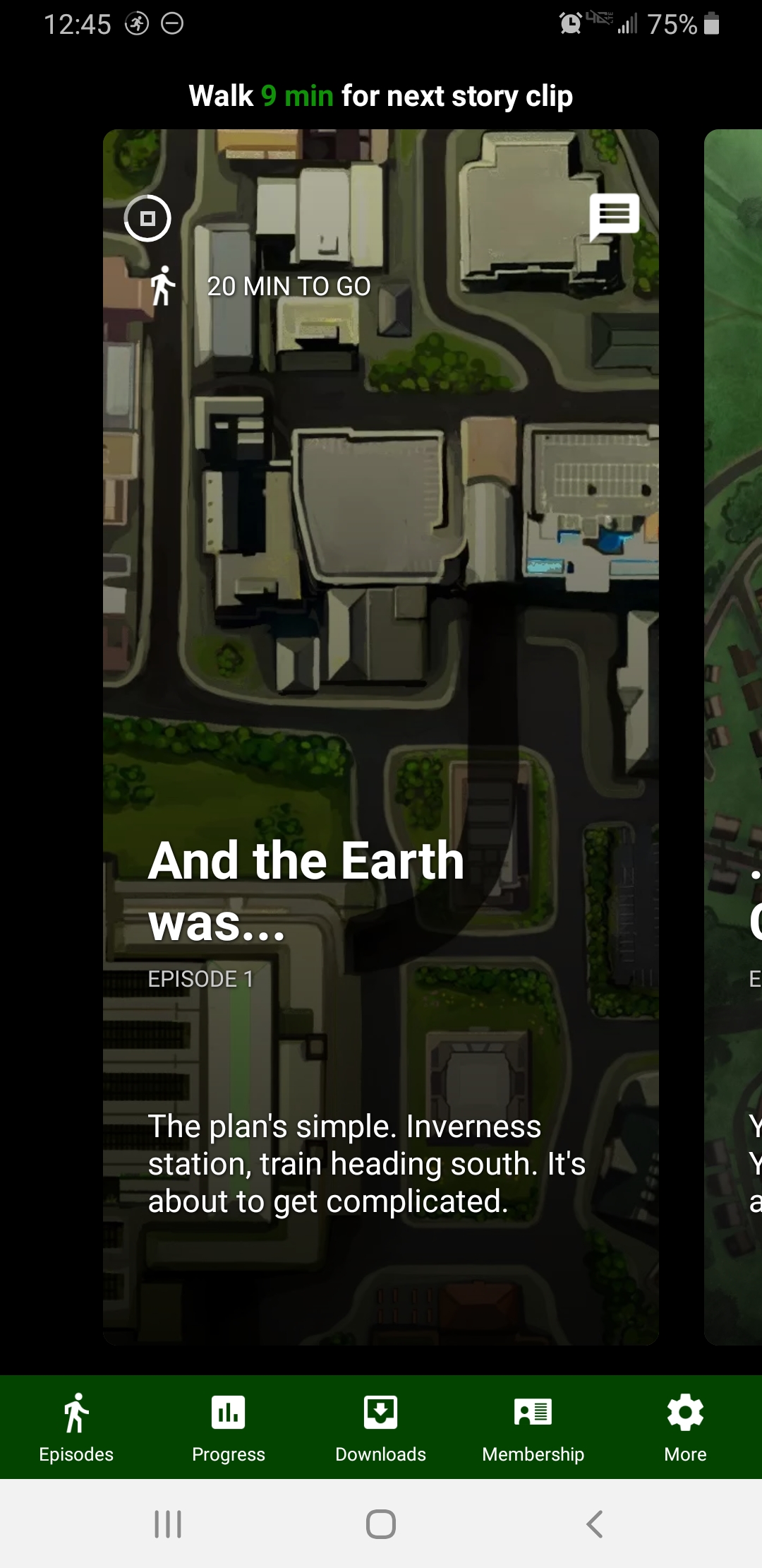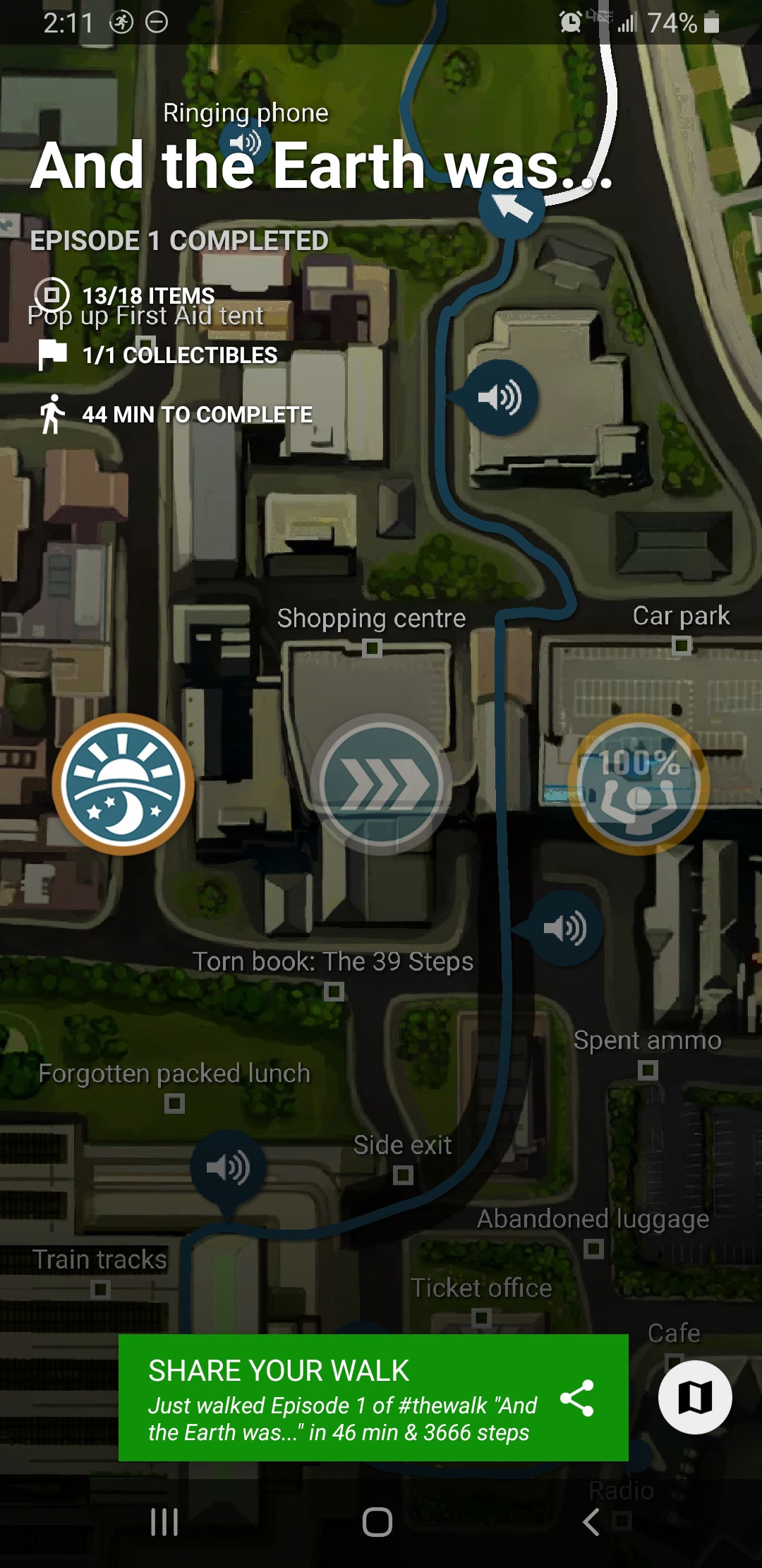 The Walk, as I understand it from the various blog posts, was created in large part to encourage people to get out and get walking. And unlike Zombies, Run, which (mostly) allows you to set how long you want a mission to be based on how long you’re running/walking or how far you’ve gone, The Walk so far appears to be pretty strictly time-based in that you have to walk for so many minutes to complete each episode… though it still needs to be able to detect that you’re moving, so no “leaving the phone on the charger while I exercise” for me.