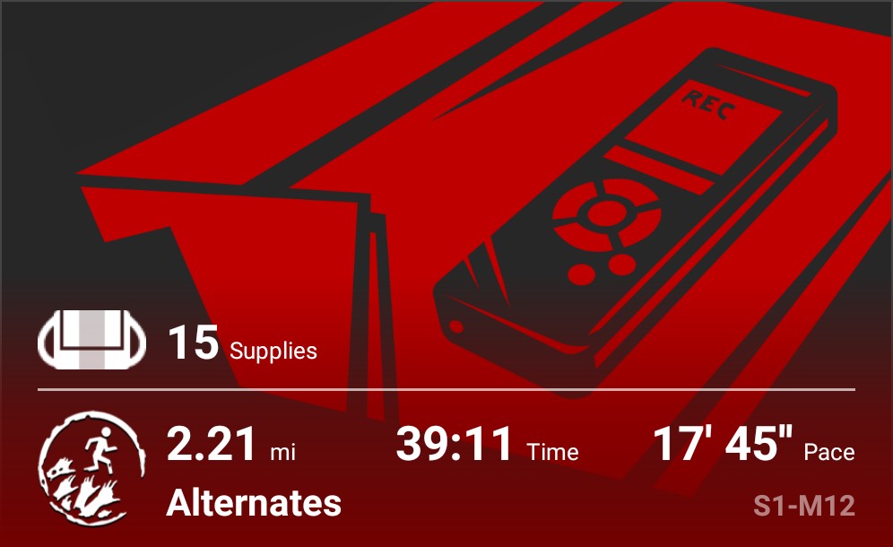 Since I still haven’t worked out a plan for The Walk that I’m happy with, I think I’ve decided to repeat the Homefront bodyweight exercises for my get-home-from-work workouts. No “materials” collected during those missions but I’d still get plenty of supplies each time, which will help whenever I get around to building up my base. (I won’t be posting run graphics of the repeats, though; since the missions are purely time-based due to the nature of the workouts, the only significant difference you’d see between the second time around and the first is if I don’t hit the “stop” button at the same time as I did before.)