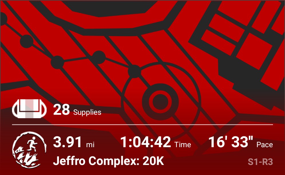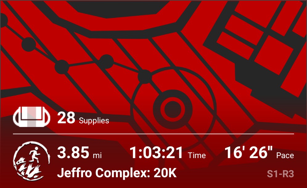 That leaves the New Canton 20K and (checks app) 5 normal missions if I hope to finish out the season before the weather keeps me off the road like it did back in February. After that, maybe I’ll rerun the New Adventure “Negative Space” at least once (five bodyweight episodes, two “running”), since I’m absolutely certain I’d seen a notification or blog post (that I can no longer locate) saying that SixtoStart has begun adding story-themed supplies to the NA stories that you could collect for Abel. I’m trying to find a list of all available supplies, though, just so I can tell if I’m missing anything.