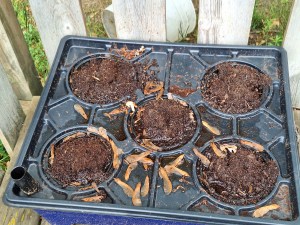 There I proceeded to fill it–every spot–with those same leftover cherry tomato seed pods. Only afterwards did I learn that you’re only supposed to put two of them in there due to how big around they get so once the weather allowed we transplanted four of them outdoors.